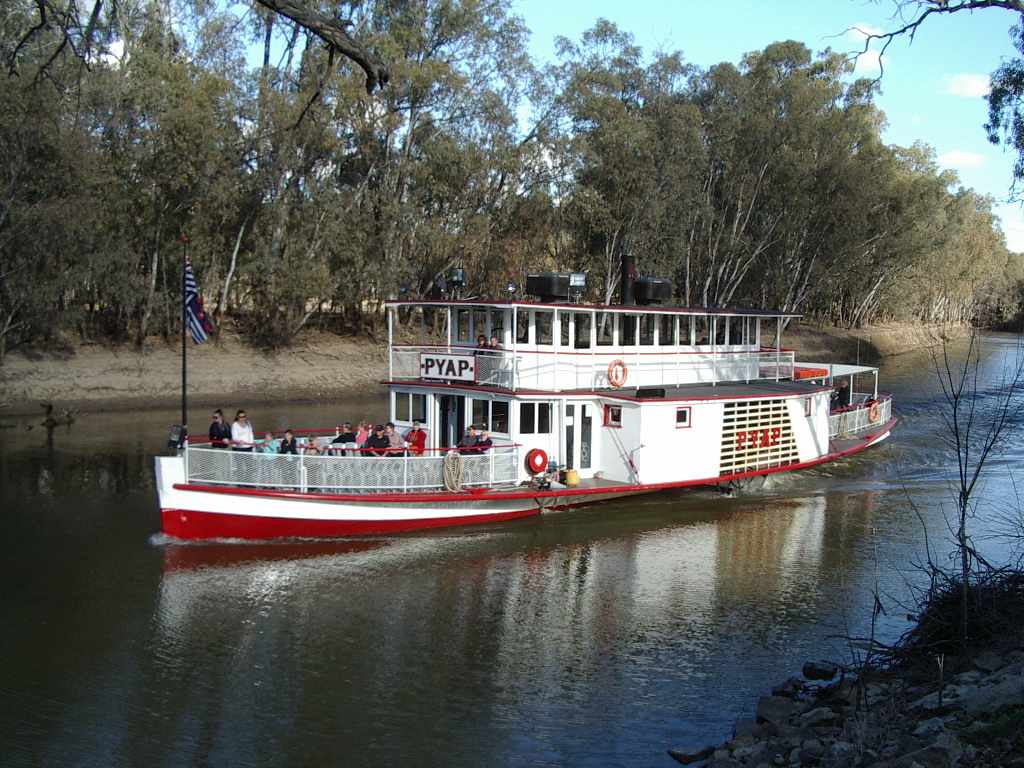 Description: The paddle ship PYAP seen on a tributary of the Murray River at Swan Hill Victoria. The sun is shining and it is bitterly cold.