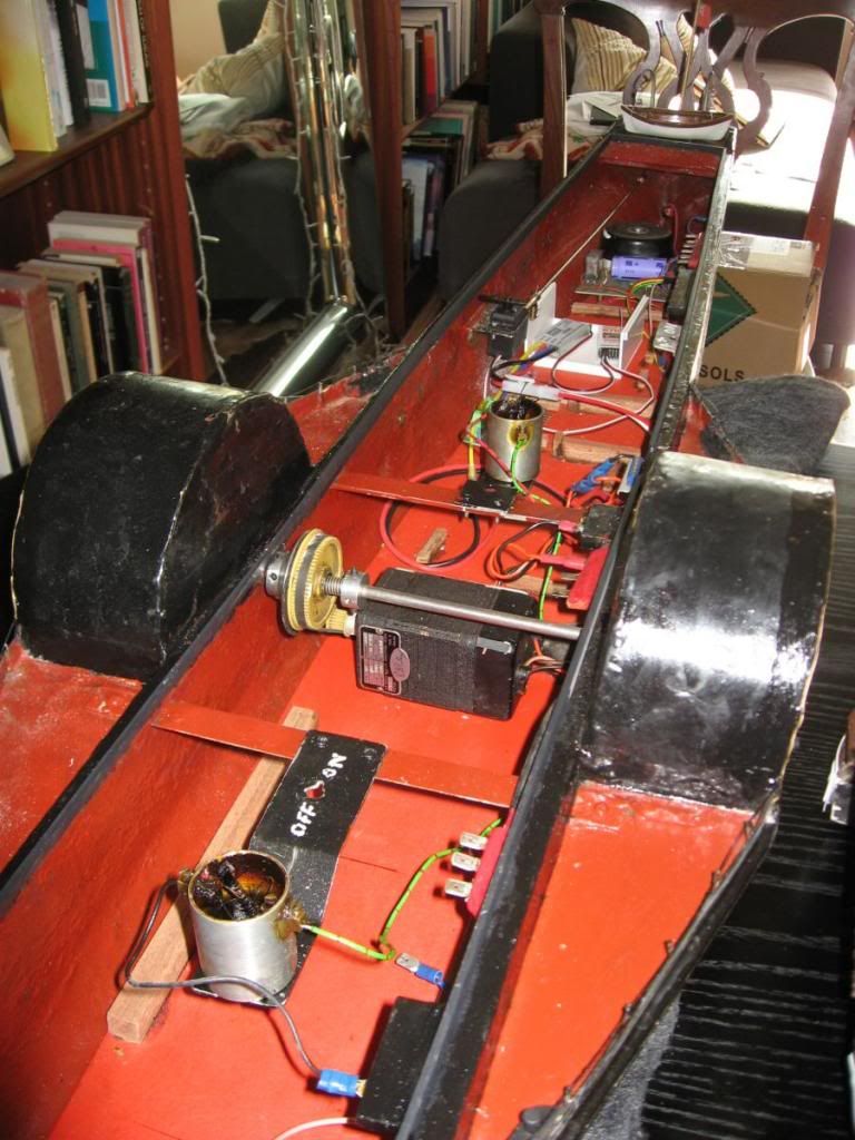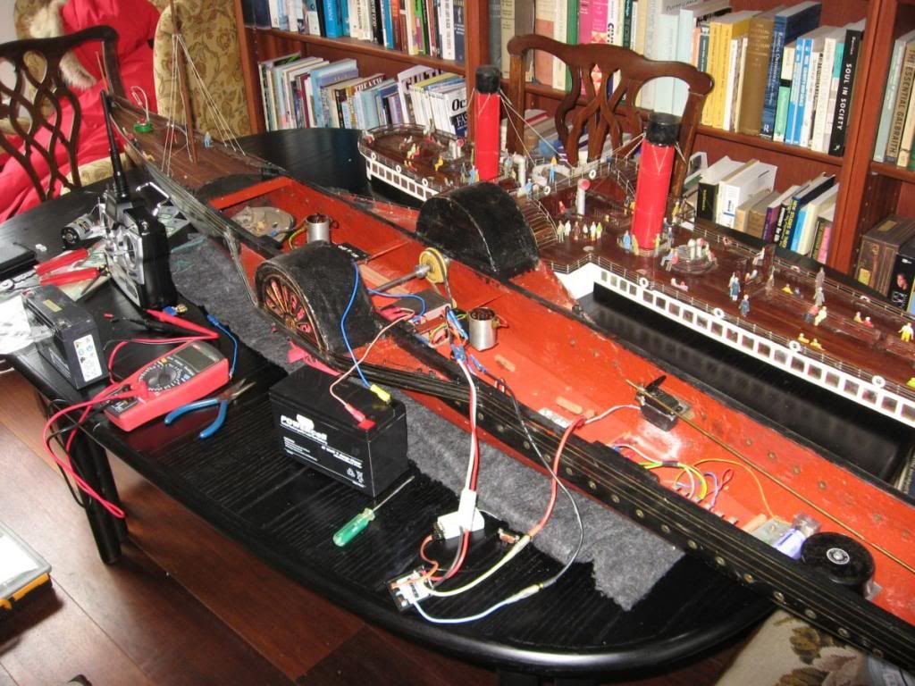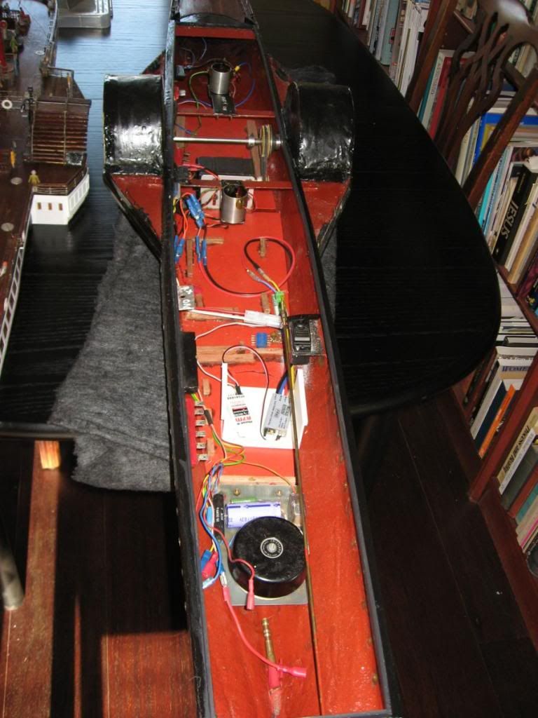 As expected, when I collected it, it was full with George's electronic wizardry to allow paddles, rudder, horn (an old car horn), ships telegraph bell (an old house door bell), smoke (oil baths) and three light systems:- navigation, saloon and deck. He was also running on 12GHz radio of his own design.