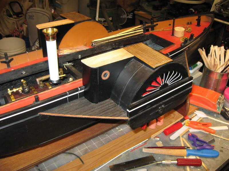 As The wait for the final plumbing parts drags on - more deck details attended to - rear steps up the paddle boxes, piping aft or the stack ( made from spend 22 casings and thick solder bent into shape!)the foredeck skylight made and new mast placement drilled and fitted and a few other small things done. Also made the tow hook functional after affixing it and making the hook spring centering. A rear bowser line will help keep any tow line and  job centered and directing the leverage down on the wheels- if I do any real tow activities..we will see with careful testing.