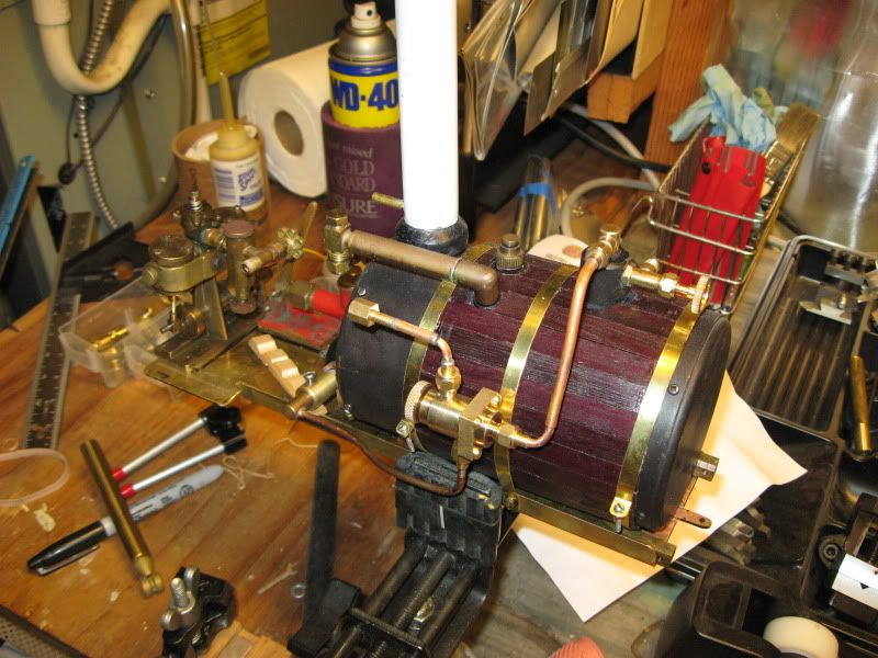 I still need to get the feedpump done ans the steam feed line running forward to the stack. There the feed will take a dodge through the stack and down into the flue return on the Cheddar boiler- - as it has a removable end cap- that part will be much easier. The it will exit just under the top site glass support tube and on toward the engine running parallel to the site glass tube and then hanging a big rt hand turn.